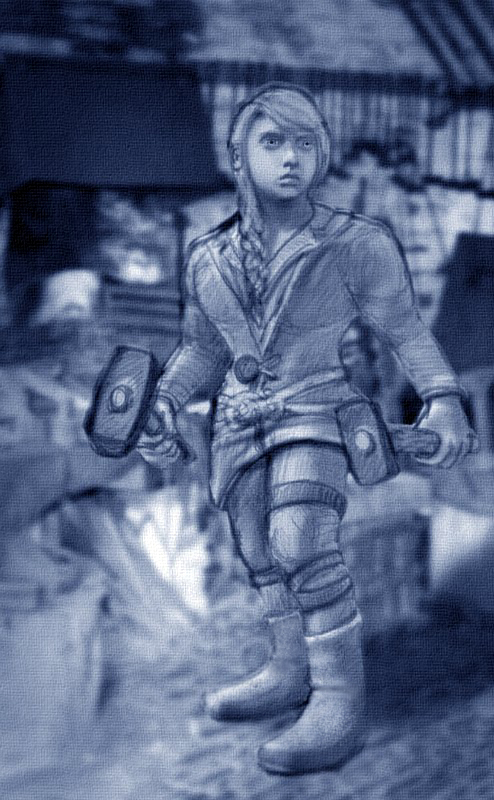 She wouldn’t ruin this day by thinking about him. She grabbed his old jacket. The sleeves crudely hemmed to fit her shorter arms but the shoulders were broad enough and she had sewn two straps to the sides which allowed her to belt it at the waist. It was an ugly thing. Still, it was warm and it allowed her to hide her unusually muscular arms and the old scars and burns left by her work. She slid her finished metal work into an old carrying harnesses, one that Tebo had outgrown and given to her, then lifted it onto her back. The weight pressing down on the bruises on her back, caused only slight discomfort. Despite her intentions to avoid thinking about her father, Dulcet recalled his rage when she told him she had no coin. His addiction to glim had made him unpredictable. He had struck her repeatedly with a broom handle until it broke on her back then looked up with the splintered end gripped in his hand. Surprise filled his face, then self-loathing as he saw the unshed tears in his daughter’s eyes. He’d dropped the wood as if it were a piece hot iron, grabbed an old hammer, and run out into the street. She knew he’d try to sell the hammer but didn’t care anymore. After he left, she’d burned the remnants of the broom, and with no one to witness, sobbed quietly.